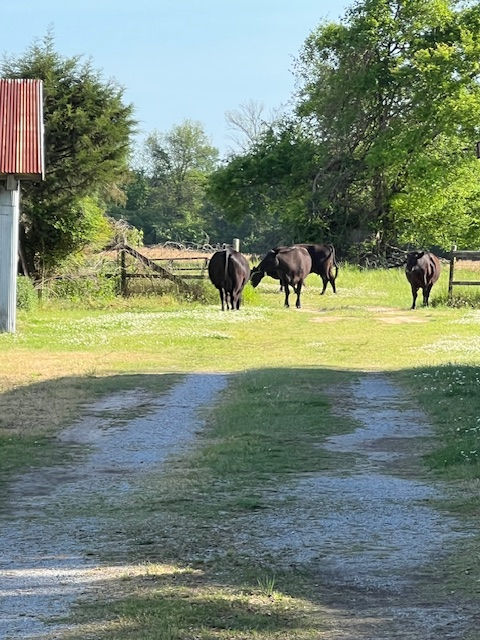 Back to business as usual on Mimi’s farm — Nathan’s black Angus heifers grazing peacefully along the gravel lane, enjoying the thick white clover after their little adventure.