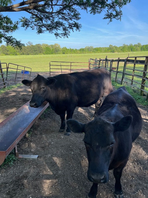 Just two of Nathan’s curious black Angus girls coming over to say hello at Mimi’s farm. After all the afternoon excitement with the loose heifers, it was good to see them calm, happy, and back where they belong — hanging out by the trough under the shade tree.